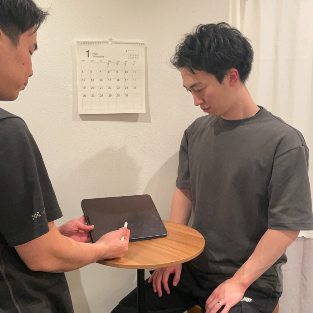 お客様のお身体の現状を詳しく知るため、運動習慣や生活習慣をヒアリングしていきます。