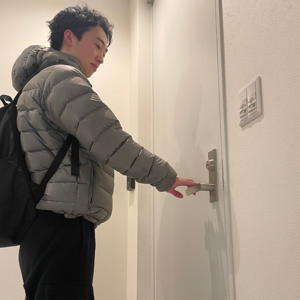 オートロックのため建物のインターホンで〔202〕を入力していただければ開錠いたします。